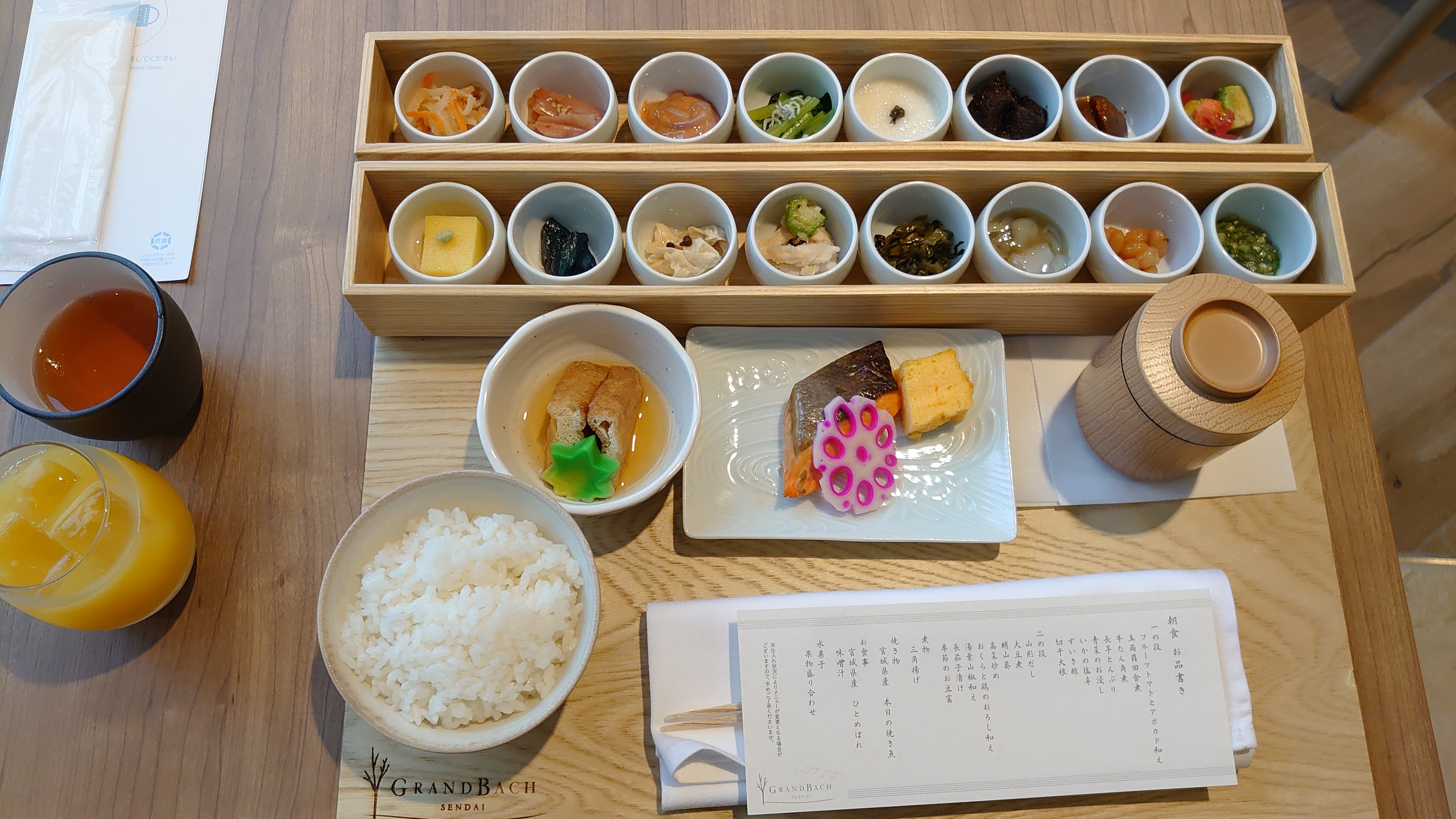 宮城県産ひとめぼれのご飯に、東北6県の食材を使用した小鉢がたくさんの見た目にも楽しいホテルこだわりの和定食です。